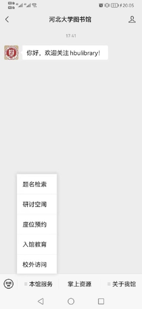 By scanning the WeChat official account of Hebei University Library, you can access to the following resources: catalogs, information service, and seating reservation etc.