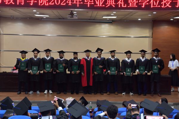毕业生汉硕生王雪峰、留学生杨爱芳分别代表中外毕业生进行了发言。王雪峰感慨道:“在大学,我们经历了无数的挑战与机遇,收获了宝贵的知识与友情。而今,我们将踏上新的人生征程,愿我们都能不忘初心,砥砺前行,成为社会的栋梁之材。”杨爱芳则深情地回顾了自己在异国他乡度过的时光:“在这里,我不仅学到了专业的知识,更感受到了中华文化的博大精深。感谢每一位老师的悉心教导,感谢每一位同学的热情帮助,我将把这段美好的记忆珍藏在心底,成为我人生路上最宝贵的财富。”