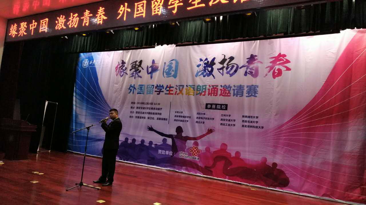2016年12月16日,缘聚中国,激扬青春——外国留学生汉语朗诵邀请赛在西安交通大学举行,共有来自于全国12所高校的60余名各国留学生参加了此次比赛,bat365中文官方网站的三名留学生在比赛中取得佳绩。