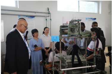 在高阳职教中心纺织一体化实训基地,代表团一行了解了该校职业教育体系,考察了整经、穿综、穿筘、织造等织造环节,团员们亲自现场体验了围巾织造技艺。