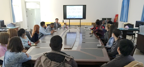 10月8号,我院特邀文学院徐文武教授,为孔子学院奖学金生举办了“重阳节古典诗词赏析讲座”。讲座开始时,徐教授首先与留学生进行互动,用询问的方式了解其他国家的传统风俗节日,再转回到中国的传统节日,主要介绍了重阳节的风俗习惯以及与重阳节有关的古典诗词。通过徐教授生动精彩、声情并茂的讲解,孔院奖学金生对中国的传统节日及中国古典诗词产生了浓厚的兴趣。讲解结束后,留学生积极提问,徐教授耐心讲解。讲座结束后,徐教授与留学生合影留念。