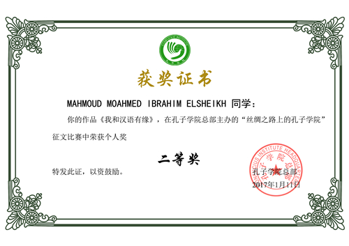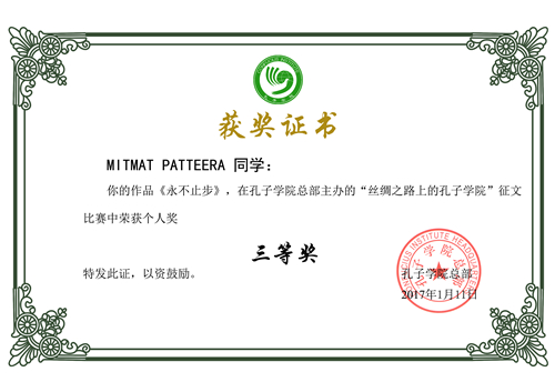 近日,孔子学院总部公布了“丝绸之路上的孔子学院”征文大赛结果,bat365中文官方网站2016级孔子学院奖学金汉语国际教育硕士墨子(苏丹)、潘迪娜(泰国)以《我和汉语有缘》、《永不止步》两篇文章分别获得二等奖和三等奖。