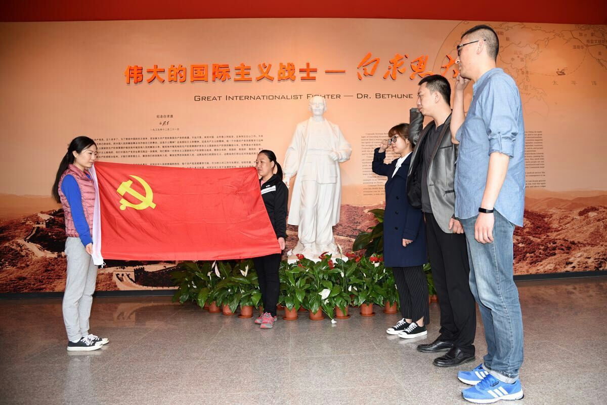 活动当天,天空下着蒙蒙细雨,白求恩纪念馆在雨中显得格外庄严肃穆。白求恩同志无私奉献精神深深地感动了在场的每一位党员,毛主席曾经这样评价白求恩同志:“我们大家要学习他毫无自私自利之心的精神。从这点出发,就可以变为大有利于人民的人。”参观学习后,三位新入党的同志高飞、温子楠和王宇面对鲜红的党旗举行了入党宣誓和佩戴党徽仪式。随后,校组织部部长徐建民同志就《中国共产党党章》进行了细致生动地解读。