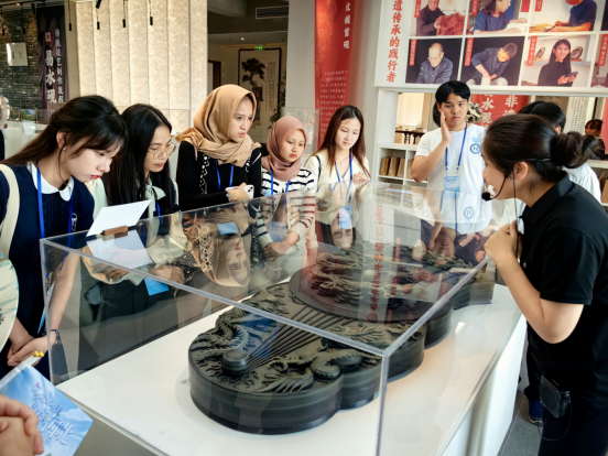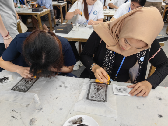 午餐后,留学生们前往易水非遗体验馆,深入了解了易水砚这一中国著名古砚的制作技艺。他们亲手尝试易水砚拓和满族结绳技艺,不仅直观感受了易水砚的制作过程,更深刻体会到了中国传统匠人精神和书法文化的深厚底蕴。我院留学生一致表示,这次活动让大家更深入地了解了中国的文化,也让他们更加喜欢中国,喜欢保定。