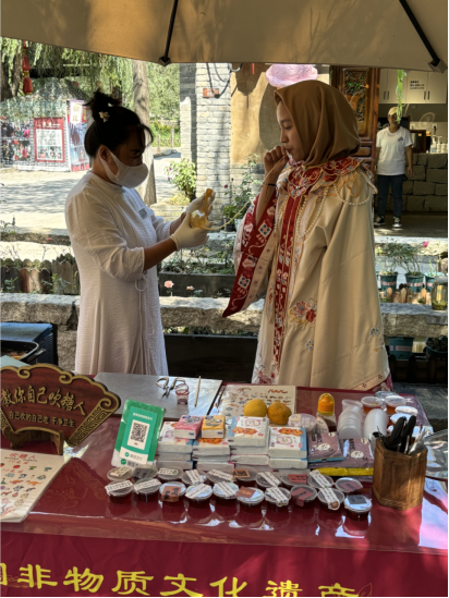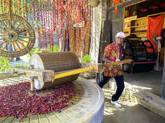 上午抵达易县后,他们首先被太行水镇那巍峨耸立的大牌楼深深吸引,纷纷驻足拍照,记录下这难忘的瞬间。在辣椒坊,留学生们亲眼见证了传统石磨技艺如何将辣椒研磨成各式辣椒制品,对这一独特的制作过程表现出了极大的兴趣。随后,留学生们换上汉服,沿着古朴的石板路漫步,欣赏着沿途的自然风光,耳畔不时传来远处老茶壶广场上河北梆子的悠扬唱腔,为这次文化之旅增添了浓厚的艺术氛围。留学生们亲身体验了印章和漆扇的制作工艺以及制作糖画、吹糖人,亲手完成的作品让他们兴奋不已,深刻感受到了中国传统手工艺的精妙与魅力。
