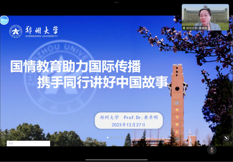 12月27日下午,我院组织开展了第20期跨文化交际讲座。本次讲座邀请到了郑州大学国际教育学院副院长黄卓明教授,讲座主题为“国情教育助力国际传播,携手同行讲好中国故事”。我院副院长王丽霞主持,全体专任教师及国际中文教育专业中外籍研究生等80余人参加了本次讲座。