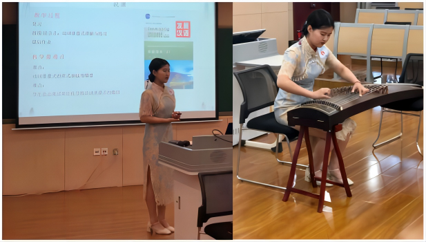 我院马诗瑶参加本次研究生赛道的比赛,在教学设计环节,她别出心裁,以创新的思维和理念,打造出一个个富有创意和吸引力的课堂。用7分钟的时间,通过运用多媒体技术,让教学内容更加直观形象,积极引导学生参与课堂讨论,激发学生的学习兴趣。马诗瑶学习古筝已有10年之久,本次比赛中,中华才艺也是表演了古筝曲《战台风》,以生动的传统音乐展现中国文化魅力。